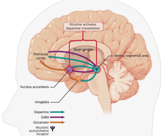 - La nicotina actúa principalmente sobre los receptores nicotínicos de acetilcolina (nAChRs), localizados en áreas del cerebro como el área tegmental ventral (VTA).