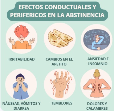 - Se desarrollan síntomas de abstinencia al cesar el consumo: ansiedad, irritabilidad, dificultad para concentrarse, aumento de apetito, insomnio y anhedonia.